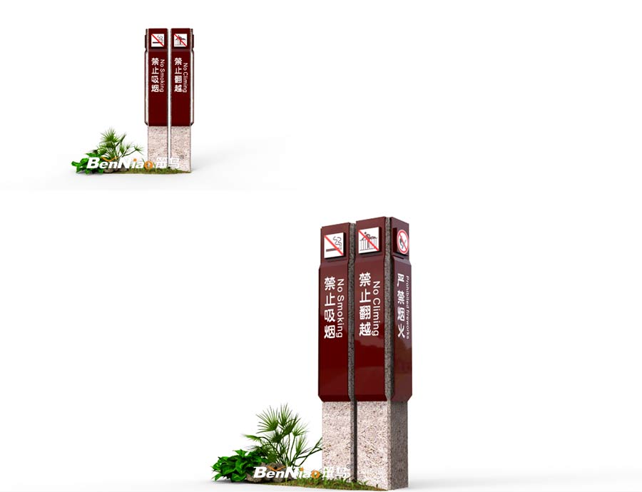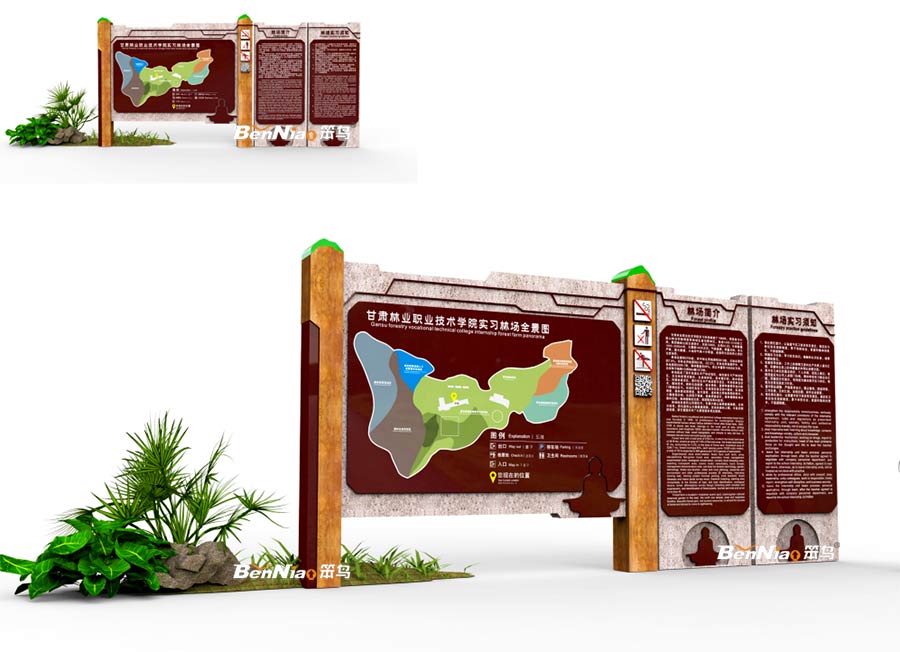 在材質(zhì)的運(yùn)用上,由于面對的是更具生態(tài)的戶外標(biāo)識,所以我們選用經(jīng)久耐用,以及防腐性更強(qiáng)的不銹鋼材質(zhì)在表面做仿石紋和仿木紋效果,結(jié)合旅游景區(qū)標(biāo)識牌標(biāo)準(zhǔn)顏色,使之更具符合項目環(huán)境,真正達(dá)到標(biāo)識與環(huán)境的融合,協(xié)調(diào)和統(tǒng)一。