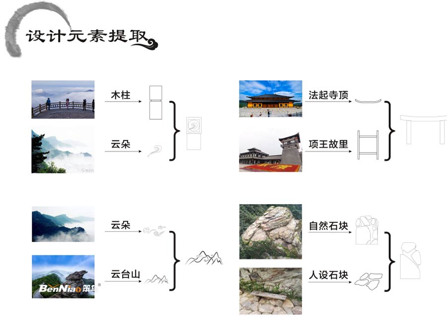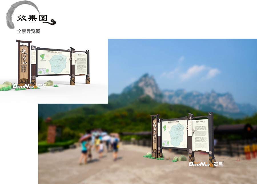本次海上云臺山導視系統(tǒng)方案,我們將運用木紋,天然石塊,以及一-些自然的環(huán)境特點,來體現(xiàn)云臺山“清幽秀麗、自然靈境、完整生態(tài)”的設計風格,提取元素并轉化為導視系統(tǒng)的一部分,使其與云臺山融為一體,讓標識融入整體的環(huán)境,營造和諧共融。