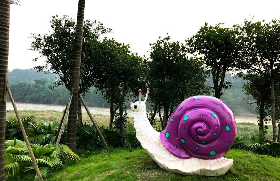 小品以蝸牛造型為載體,蝸牛雖然沒有矯健的身姿,但其不懈努力、執(zhí)著爬行的精神讓人敬佩,用黃、紫、橙展現(xiàn)出蝸牛的活潑可愛,整個(gè)雕塑充滿歡樂。立體化地展現(xiàn)了赤水河旅游景區(qū)生命脈絡(luò),充滿正能量。