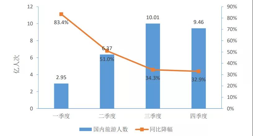 2020年文化和旅游部通過積極爭取紓困政策、指導(dǎo)地方用足用好政策、抓好項目建設(shè)、推動產(chǎn)業(yè)創(chuàng)新發(fā)展、加大金融支持產(chǎn)業(yè)高質(zhì)量發(fā)展等措施,推動旅游業(yè)復(fù)蘇取得顯著成效,國內(nèi)旅游呈現(xiàn)分季度降幅收窄趨勢。