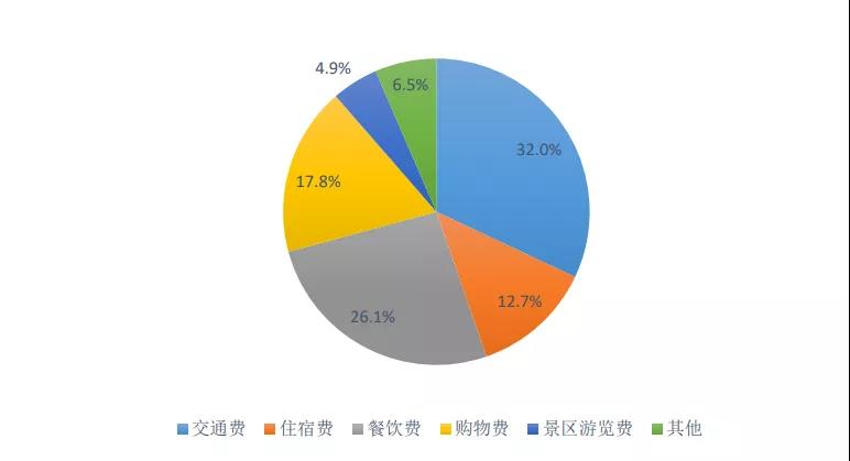 2019年農(nóng)村散客旅游者的出游花費(fèi)中,交通費(fèi)所占比重最高,達(dá)到了32.0%;其次是餐飲費(fèi),占到了26.1%;再次是購物費(fèi),占到了17.8%。