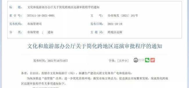 2021年4月,國務(wù)院辦公廳印發(fā)《關(guān)于服務(wù)“六穩(wěn)”“六?!边M一步做好“放管服”改革有關(guān)工作的意見》(國辦發(fā)〔2021〕10號),明確制定跨地區(qū)巡回演出審批程序指南,優(yōu)化審批流程,為演出經(jīng)營單位跨地區(qū)開展業(yè)務(wù)提供便利。