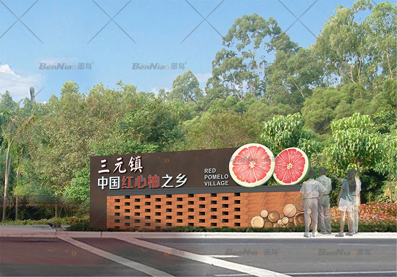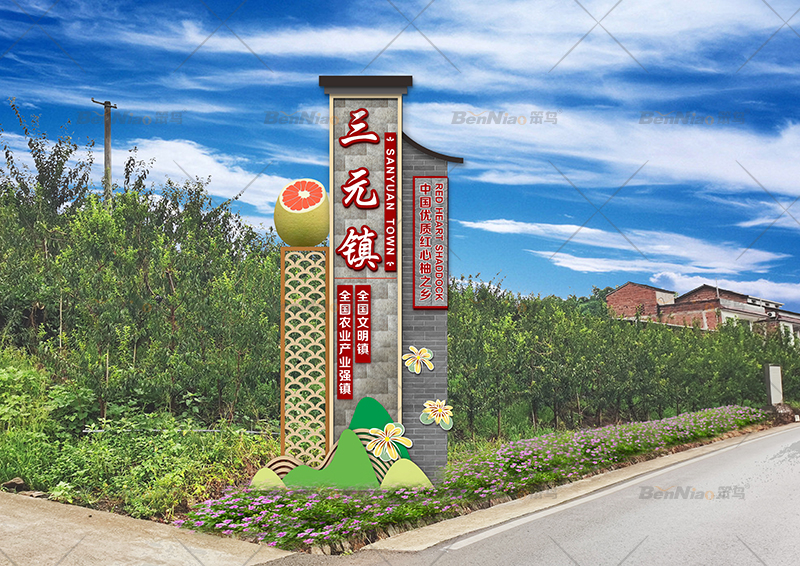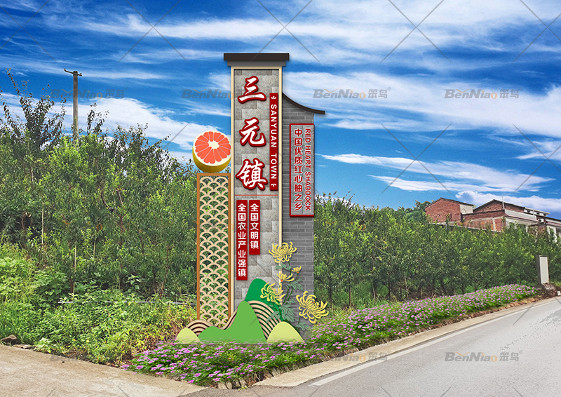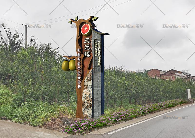 近年來,各種美麗的鄉(xiāng)村越來越多,美麗鄉(xiāng)村標識牌作為鄉(xiāng)村的規(guī)劃和建設的一部分,也顯得越來越重要。“主題形象標識”是標識牌的一種形式,是形象,標志,理念等表達傳播的一種具象化展示形式。笨鳥為豐都縣三元鎮(zhèn)設計制作的形象標識,詮釋了三元鎮(zhèn)的發(fā)展理念,提升鎮(zhèn)區(qū)品位。寓意以產(chǎn)業(yè)為依托振興鄉(xiāng)村經(jīng)濟發(fā)展。