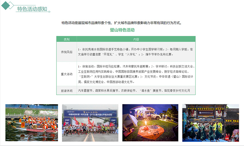 特色活動是展現(xiàn)城市品牌形象個性、擴大城市品牌形象影響力非常有效的行為方式。圍繞“儒雅璧山·田園都市”品牌形象定位,堅持傳承與創(chuàng)新相結合,可從傳統(tǒng)風俗、重大活動等方面策劃設計城市特色活動感知系統(tǒng),不斷強化城市品牌動態(tài)識別。