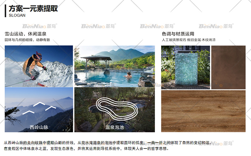 景觀規(guī)劃設(shè)計(jì)中,文化元素是設(shè)計(jì)的靈魂,是一個(gè)優(yōu)秀景觀的重要支撐及其價(jià)值體現(xiàn),在滿足物質(zhì)需求的同時(shí)將文化元素融入度假區(qū)景觀設(shè)計(jì)中,使度假區(qū)以深厚的文化底蘊(yùn)為依托,令人在休閑娛樂之中感受到文化的魅力,滿足人們精神需求。我們?cè)谠O(shè)計(jì)西嶺雪山.花水灣旅游度假區(qū)氛圍景觀時(shí)以自然環(huán)境與文化背景為基礎(chǔ),將雪山、溫泉、小鎮(zhèn)、建筑、運(yùn)動(dòng)等作為設(shè)計(jì)的出發(fā)點(diǎn)和延伸,給人們一個(gè)整體統(tǒng)一的度假區(qū)形象。