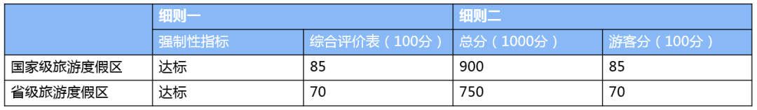 旅游度假區(qū)的等級(jí)劃分細(xì)則分為兩部分?!都?xì)則一》用于旅游度假區(qū)基礎(chǔ)評(píng)價(jià),內(nèi)容包括強(qiáng)制性指標(biāo)、資源環(huán)境與度假產(chǎn)品綜合評(píng)價(jià)?!都?xì)則二》用于旅游度假區(qū)現(xiàn)場(chǎng)檢查,對(duì)旅游度假區(qū)進(jìn)行區(qū)位與區(qū)域基礎(chǔ)、環(huán)境與度假資源、功能與度假產(chǎn)品、配套設(shè)施與服務(wù)、市場(chǎng)結(jié)構(gòu)與形象、管理與服務(wù)品質(zhì)的綜合評(píng)價(jià)。