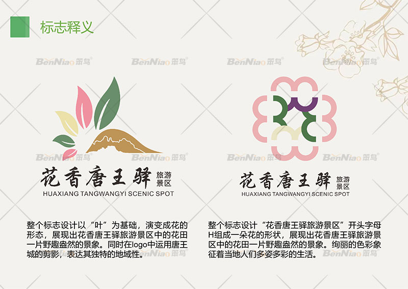 為了使花香唐王驛景區(qū)在眾多同類型的鄉(xiāng)村旅游中脫穎而出,就在文化上區(qū)別于其它地區(qū)的特色。笨鳥文旅為景區(qū)設(shè)計了獨(dú)屬他們自己的品牌形象,利用其景區(qū)獨(dú)有的特點,將其人文文化、獨(dú)特的色彩等元素提取并融入設(shè)計當(dāng)中。能清晰地看到該品牌形象設(shè)計的特點,同時運(yùn)用到景區(qū)的導(dǎo)視系統(tǒng)中。
