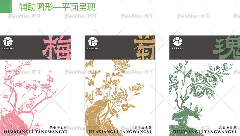 文化成為了旅游的生命,也是景區(qū)的重要吸引力,旅游文化具有極大的發(fā)展?jié)摿??;ㄏ闾仆躞A景區(qū)的文化元素眾多,在提煉元素的時候,笨鳥文旅從景區(qū)中最具代表力的花圃進(jìn)行設(shè)計,分別運(yùn)用了花圃中的梅花、菊花、玫瑰等元素繪制出三個輔助圖形,更直觀地介紹當(dāng)?shù)氐奈幕?。同時將扁平化的表現(xiàn)形式應(yīng)用在花香唐王驛景區(qū)旅游品牌形象設(shè)計之中,加上顏色,使得畫面更有沖擊力。