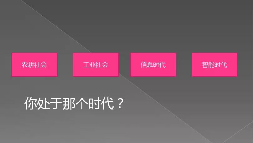 我們整個人員結(jié)構(gòu),不管是從社會來說,還是企業(yè)來說,我們現(xiàn)在的結(jié)構(gòu)是這樣的:既有農(nóng)耕社會的人也有工業(yè)社會的人,也有信息時代的人,智能時代的人,當(dāng)然信息時代與智能時代都統(tǒng)稱為工業(yè)社會,所以我下面有問你,你處于哪個時代?